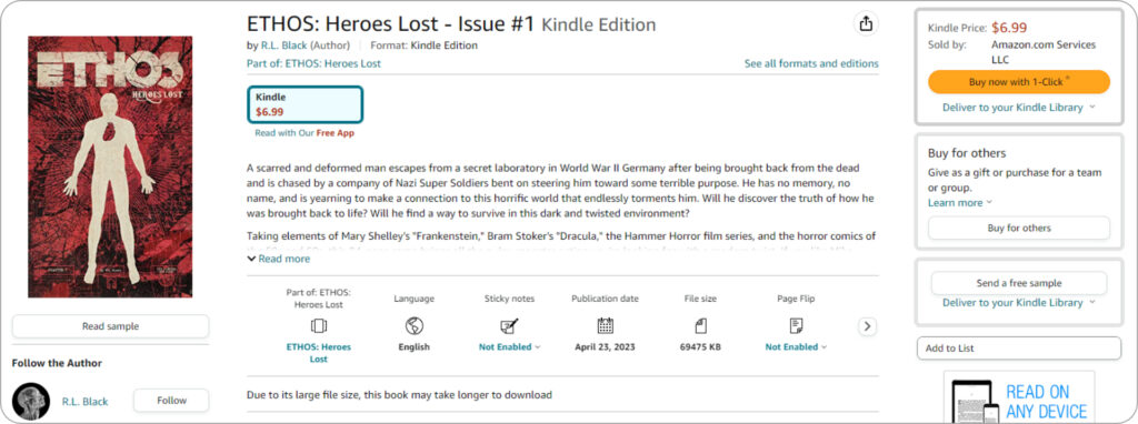 ETHOS: Heroes Lost Issue #1, the gripping horror comic book by R.L. Black, is now available on Amazon Kindle. This 90-page comic is the first issue in an ongoing series and takes readers on a journey through a dark and twisted World War II adventure. With its blend of classic horror elements and modern twists, it’s sure to keep readers on the edge of their seats.