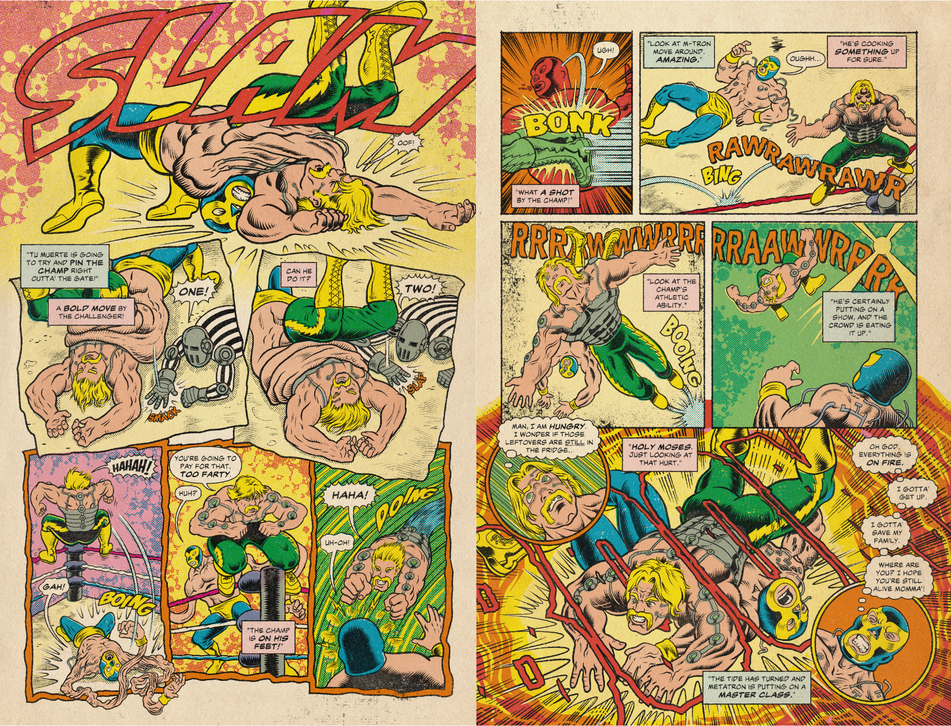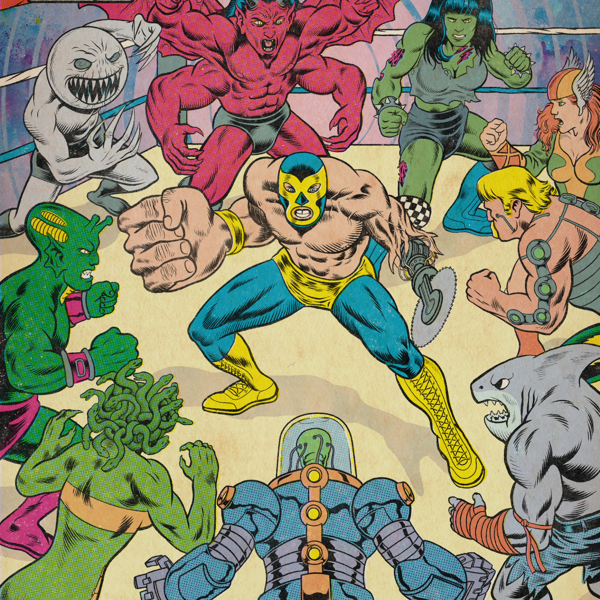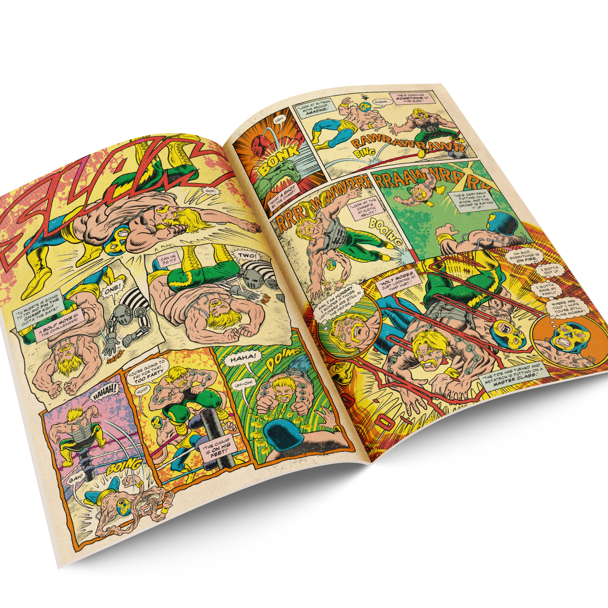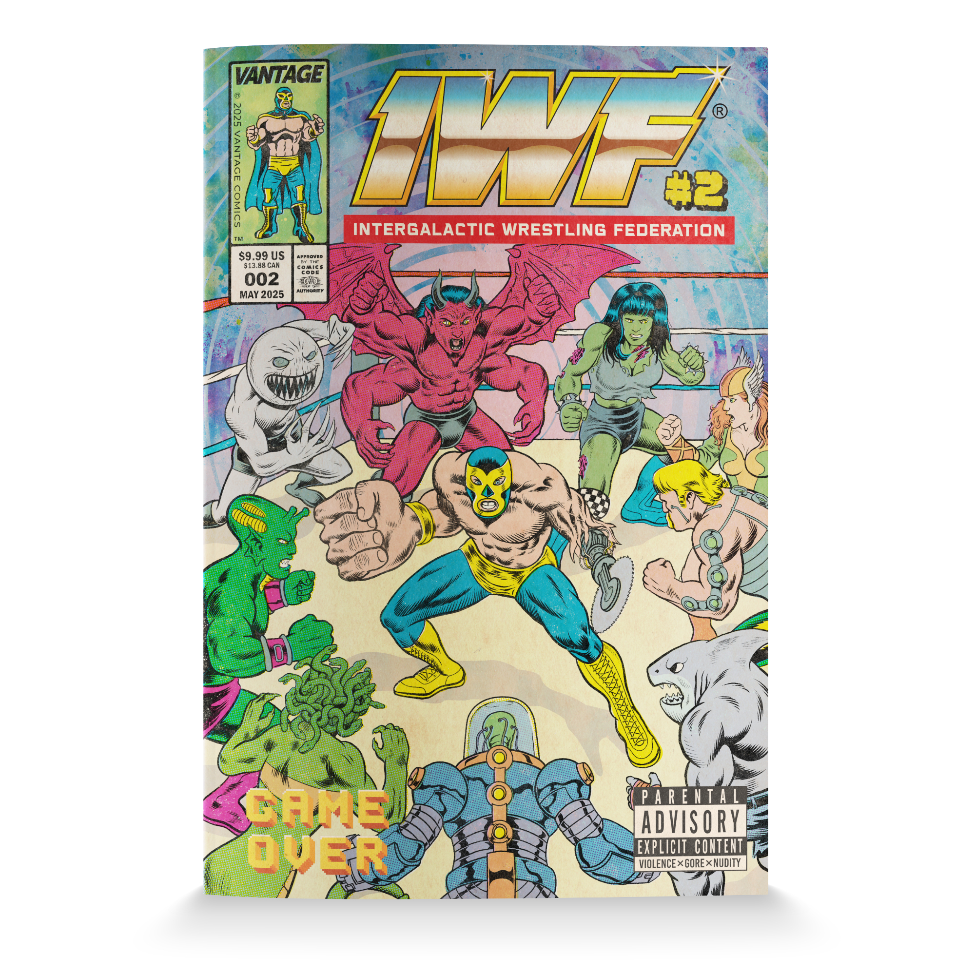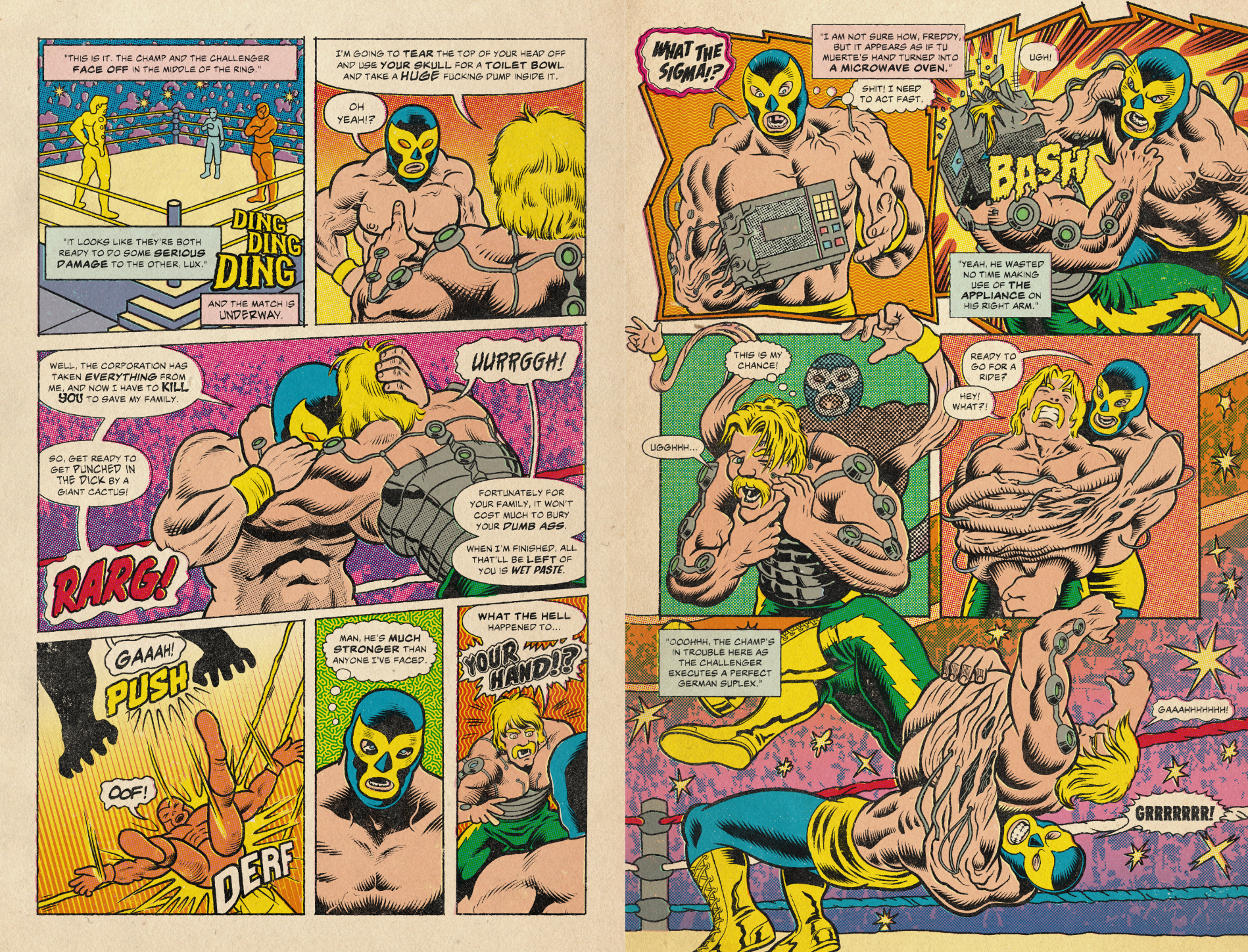With over 60 pages of full-color, retro-inspired artwork, this issue delivers nonstop combat, sci-fi spectacle, grotesque villains, and wild plot twists that fans of vintage comics and underground wrestling will love.